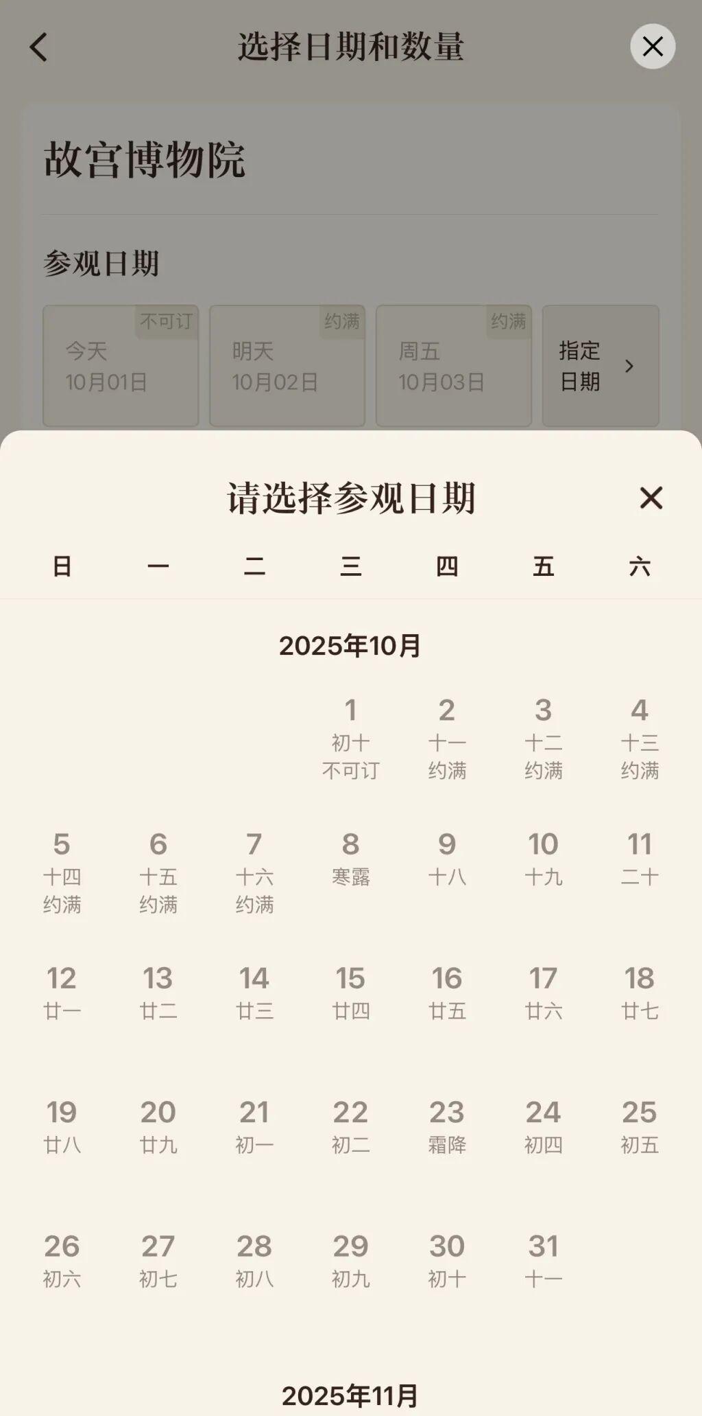 包括中国国家博物馆、故宫博物院、陕西历史博物馆、南京博物院、湖南博物院等热门博物馆等可预约时段内的门票均已约满或售罄。